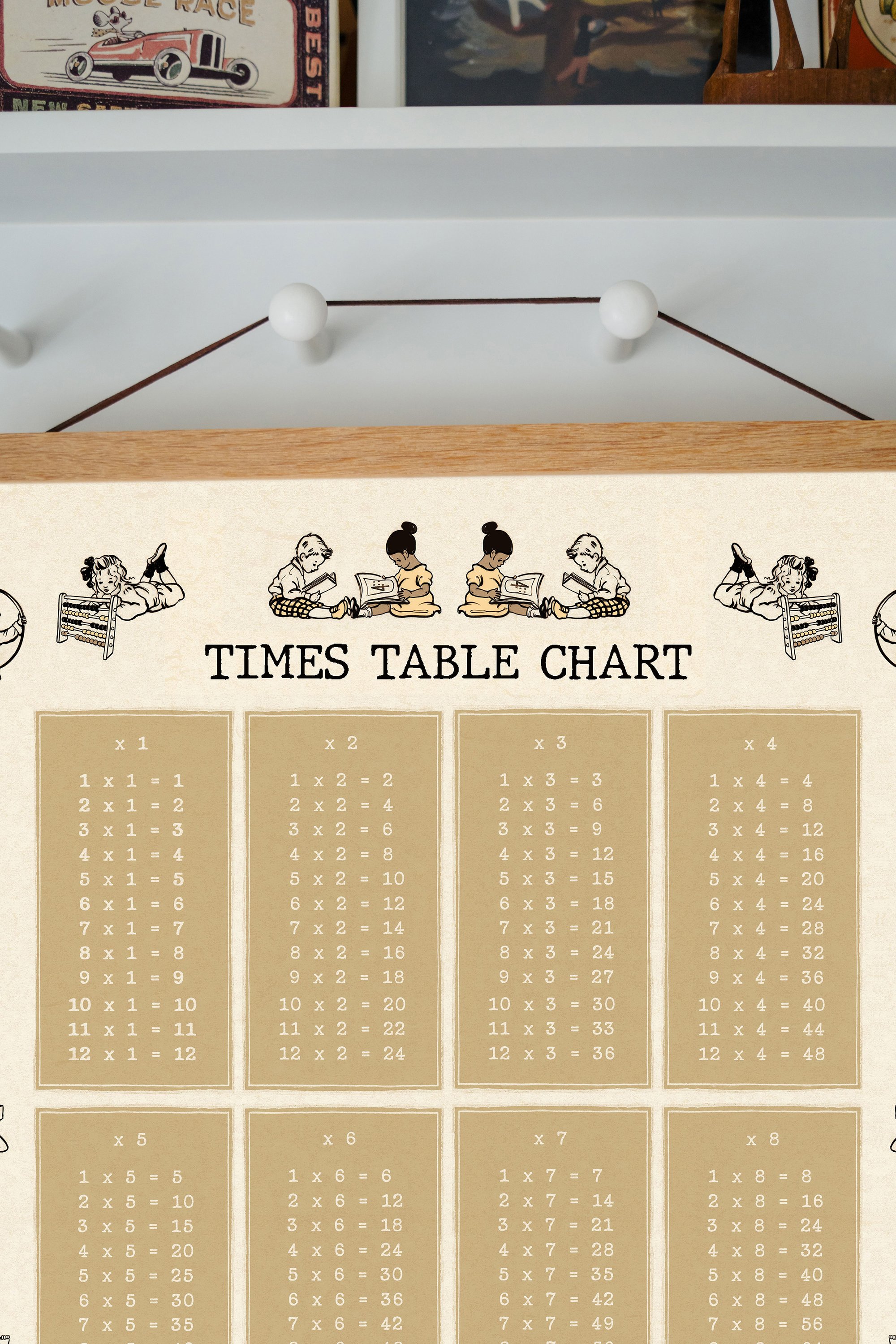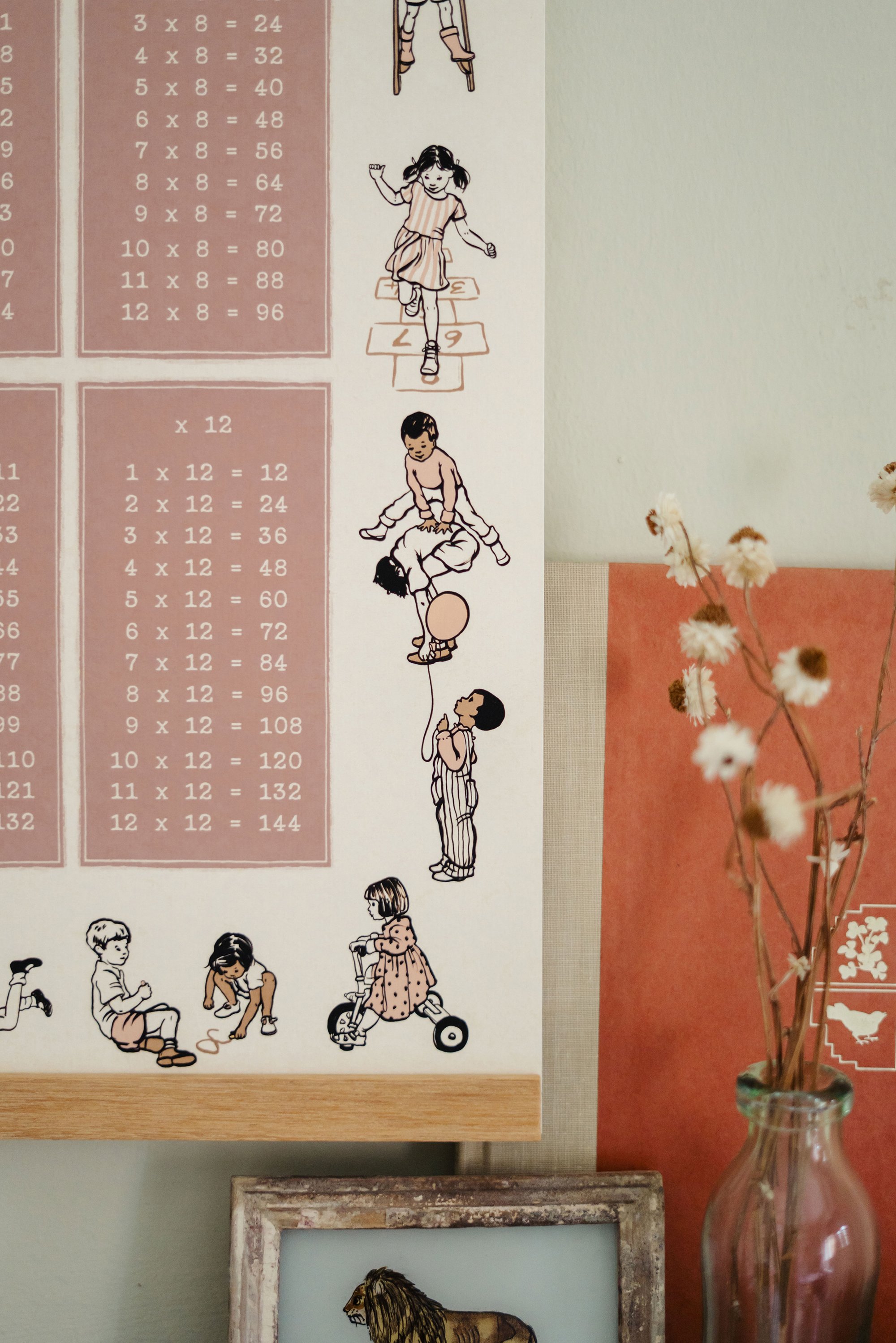 I illustrated this Times Tables Chart after searching high and low for a beautiful piece of educational art I could hang in my home, to help teach my children their times tables. Surrounding the columns of numbers 1-12 are my vintage story book style illustrations of sweet children playing, reading and counting. Available in 3 pretty colours, the perfect vintage style educational art work to adorn any playroom, bedroom or nursery (or if like me the down stairs loo!)